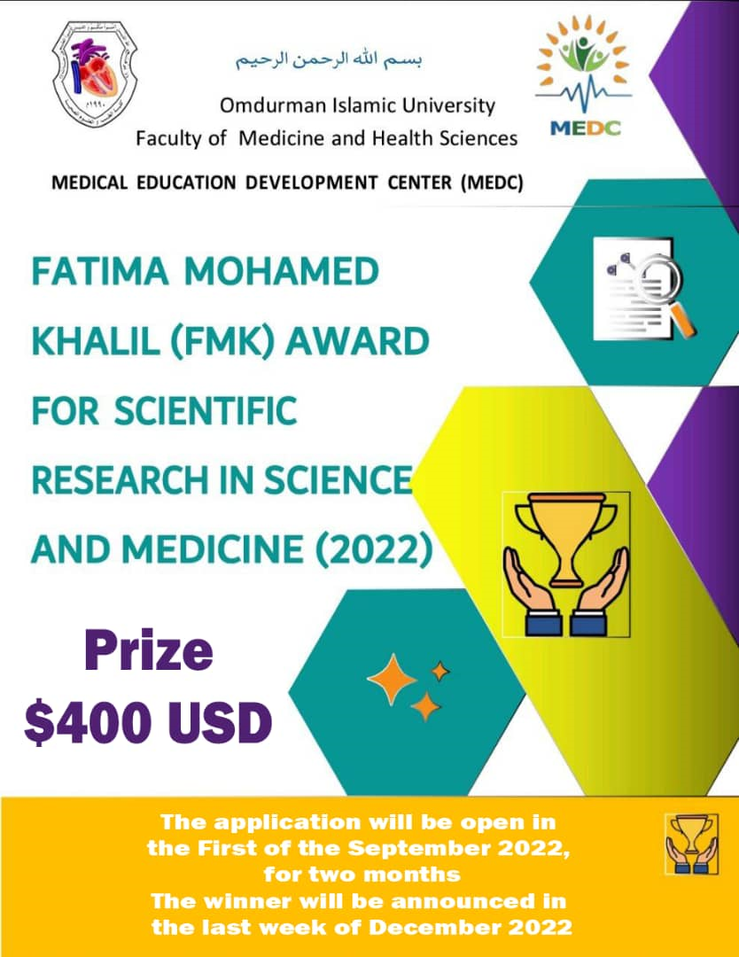 يعلن مركز تطوير التعليم الطبي بجامعة أم درمان الإسلامية عن موعد بداية التقديم لجائزة السيدة فاطمة محمد خليل للبحث العلمي في العلوم و الطب