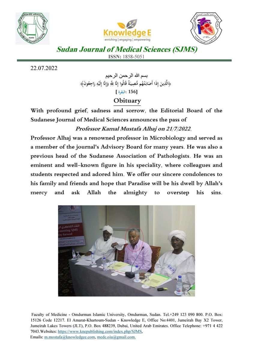 ببالغ الحزن والأسى ، تعلن هيئة تحرير المجلة السودانية للعلوم الطبية عن وفاة الأستاذ كمال مصطفى الحاج بتاريخ 21/7/2022.